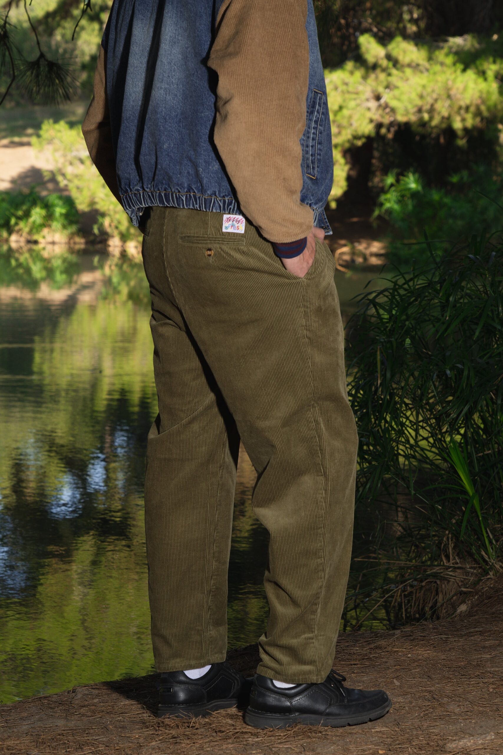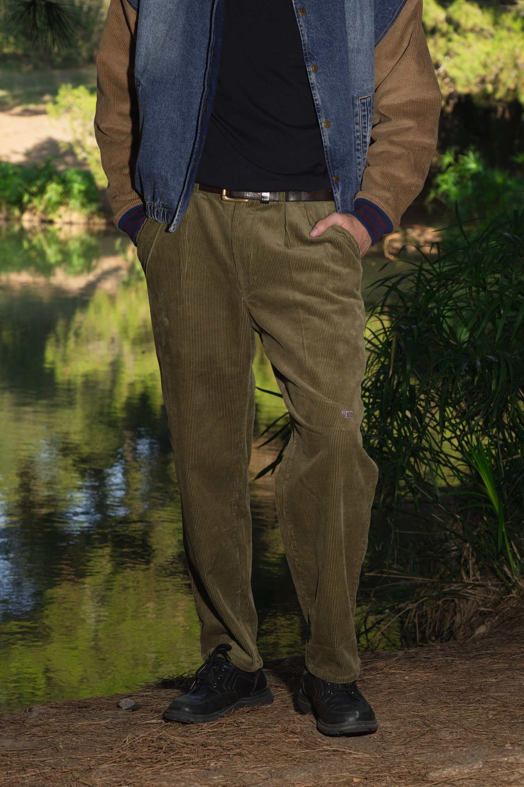 DETAILS Pleated corduroy pants Direct satin stitch embroidery TF on wearer’s left leg Button and zipper closure Side slit pockets Two single welt rear pockets with button closure TF woven patch above right rear pocket Belt loops 100% Cotton, 315gsm 8-wale corduroy FIT Unisex regular fit Size Medium: Waist: 33″ Hip: 44″ Inseam: 29″ Leg opening: 15.75″ Will is 6’3″ and wearing size 32 Model’s chest/bust: 39″ Model’s waist: 34″ Model’s hip: 38″ Jillian is 5’6″ and wearing size 26 Model’s chest/bust: 35″ Model’s waist: 25″ Model’s hip: 37″